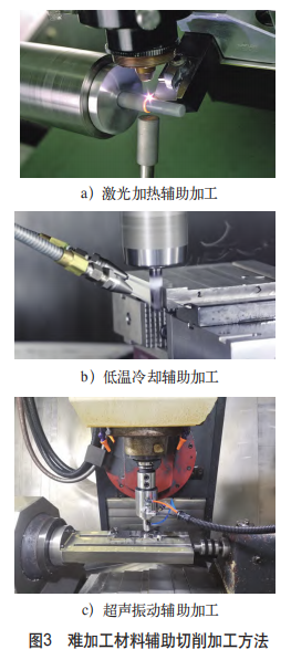 低溫冷卻輔助加工[10](見圖3b)則是使用液氮、高壓二氧化碳?xì)怏w等冷卻介質(zhì)噴涂到切削部位,對切削加工過程進(jìn)行冷卻,避免因?yàn)椴牧蠈?dǎo)熱性能差引起的局部切削溫度過高問題,還使得工件局部冷脆,增強(qiáng)斷屑效果。英國的Nuclear AMRC公司成功使用高壓二氧化碳?xì)怏w對鈦合金的加工過程進(jìn)行冷卻,與干切削狀態(tài)對比分析表明,低溫冷卻輔助加工不僅能夠降低切削力,提高切削加工表面的質(zhì)量,還能有效減小刀具磨損,增長刀具的使用壽命。此外,超聲振動輔助加工[11,12](見圖3c)也是難加工材料高效切削加工的有效方法。通過在刀具上施加高頻、微小幅度的振動,實(shí)現(xiàn)加工過程中刀具與工件之間發(fā)生間斷性分離,改變了材料去除機(jī)理,增強(qiáng)了動態(tài)切削的穩(wěn)定性,有效避免刀具與已加工表面間的摩擦,降低切削溫度和切削力,降低表面粗糙度值,減小刀具磨損,其優(yōu)良的工藝效果已經(jīng)得到廣泛的關(guān)注。
