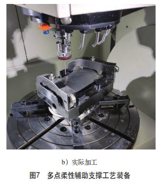 為了解決相變?nèi)嵝怨ぱb存在的弊端,眾多學(xué)者將自適應(yīng)理念融入柔性工裝的研發(fā)設(shè)計(jì)中。自適應(yīng)柔性工裝能夠通過機(jī)電系統(tǒng)來自適應(yīng)匹配復(fù)雜葉身形狀和可能存在的形狀誤差。為保證接觸力在整個(gè)葉身均勻分布,工裝通常使用多點(diǎn)輔助支撐形成支撐矩陣。清華大學(xué)王輝團(tuán)隊(duì)提出了一種適用于近凈成形葉片加工的多點(diǎn)柔性輔助支撐工藝裝備[32,33](見圖7)。該工裝采用多個(gè)柔性材料夾緊元件對近凈成形葉片的葉身曲面進(jìn)行輔助支撐,提高了每個(gè)接觸區(qū)域的接觸面積,保證夾緊力在每個(gè)接觸部位以及整個(gè)葉身上的均勻分布,從而提高工藝系統(tǒng)剛度,有效地防止葉片的局部變形。該工裝具有多個(gè)被動自由度,在避免過定位的同時(shí)能夠自適應(yīng)匹配葉身形狀及其誤差。