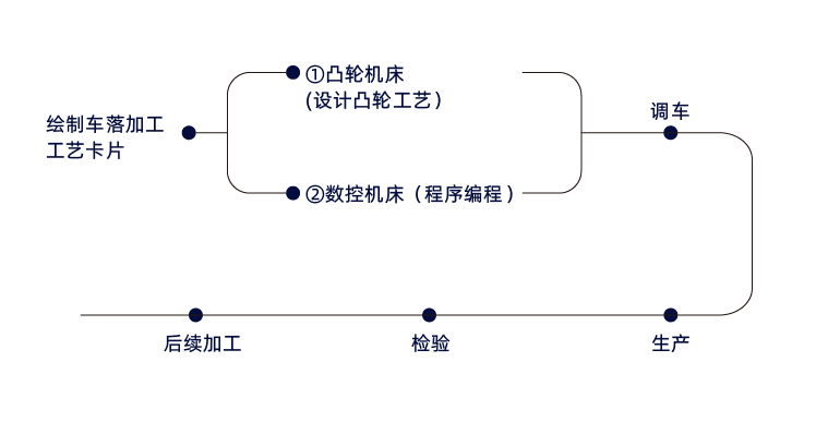 車落零件加工工序第一步需要繪制車落工藝卡片,然后通過車落工藝圖進行凸輪加工工藝(凸輪機床)的設(shè)計,并將設(shè)計好的凸輪加工工藝通過專用的凸輪加工設(shè)備加工制造出來,后續(xù)調(diào)整工通過加工制造出來的凸輪來進行設(shè)備的調(diào)整;數(shù)控機床則需通過機床G代碼M指令進行編程,通過編程好的程序進行調(diào)車實現(xiàn)復(fù)雜零件的生產(chǎn)制造。