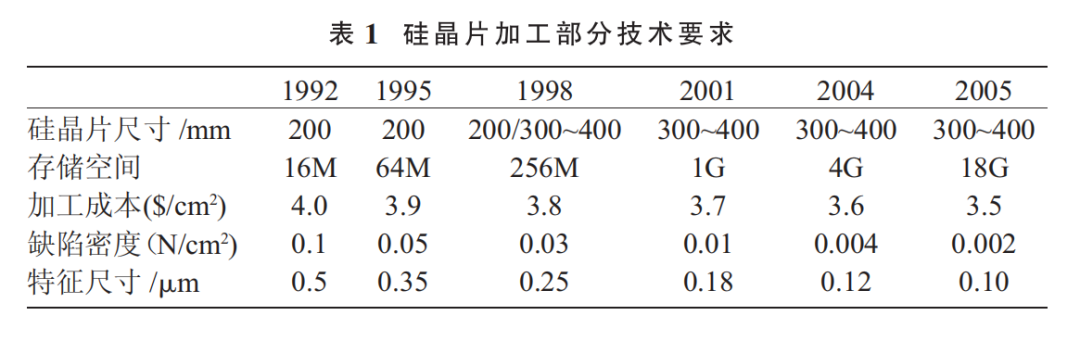 另外,在現(xiàn)代國防和軍事方面,電子信息化武裝的武器裝備在現(xiàn)代戰(zhàn)爭中發(fā)揮著越來越重要的作用,甚至起著決定戰(zhàn)爭勝負(fù)的關(guān)鍵性作用。所有這一切的發(fā)展和需要,都是建立在半導(dǎo)體硅材料的基礎(chǔ)之上。半導(dǎo)體硅材料是半導(dǎo)體工業(yè)最重要的主體功能材料,是第一大功能電子材料,至今全球硅材料的使用仍占半導(dǎo)體材料總量的95%以上。硅材料、硅器件和硅集成電路的發(fā)展與應(yīng)用水平早已成為一個(gè)國家的國力、國防、國民經(jīng)濟(jì)現(xiàn)代化及人民生活水平的重要標(biāo)志。集成電路自 1959 年發(fā)明以來,集成電路芯片 的集成度在不斷提高,而加工特征尺寸和加工成 本逐步縮小[2],如表 1 所示。