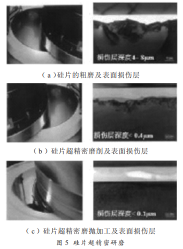 圖 5(a)、圖 5(b)、圖 5(c)為硅片的粗磨、超精密磨削和超精密磨拋加工及其表面損傷層。