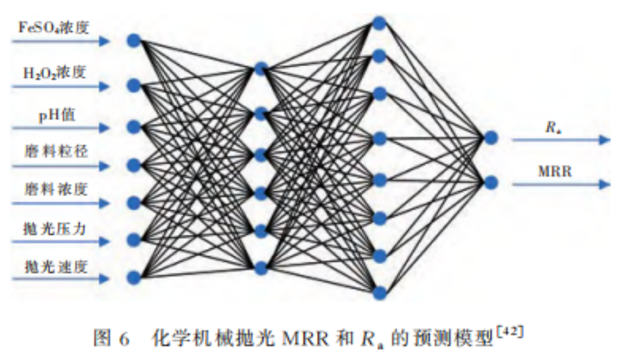 工藝參數(shù)與MRR、Ra之間的關(guān)系也可以通過建立模型來進(jìn)行預(yù)測,為SiC的CMP加工提供參考。2021年,J.Y.Deng等人基于改進(jìn)的Preston方程,研究了工藝參數(shù)對SiC拋光MRR和Ra的影響,并利用反向傳播神經(jīng)網(wǎng)絡(luò)建立了MRR和Ra的預(yù)測模型,如圖6所示。結(jié)果表明,隨著FeSO4質(zhì)量分?jǐn)?shù)、H2O2質(zhì)量分?jǐn)?shù)和pH值的升高,MRR呈先升高后降低的趨勢,拋光后Ra呈先降低后升高的趨勢。隨著磨料粒徑、磨料濃度、拋光壓力和拋光速度的增加,MRR不斷增大。Ra隨磨料粒徑和磨料濃度的增加而不斷減小,隨著拋光壓力的增加而增大,隨著拋光速度的增加而先減小后增大。不難看出,在SiC單晶的CMP中通過工藝優(yōu)化,對拋光效果起到了一定的改善和提高作用。