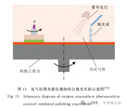 2021年,T.Yin等人采用高濃度氧氣氛圍與光催化輔助拋光相結(jié)合,對SiC襯底CMP特性進(jìn)行了研究。結(jié)果表明:與常規(guī)空氣氣氛相比,將空氣氣氛中的氧(O2)分壓增加到300kPa,Si面和C面的材料去除率均增加超過2倍。實(shí)驗(yàn)示意圖如圖15[72]所示。2022年,鄧家云使用Fe3O4作為催化劑,對電Fenton化學(xué)機(jī)械拋光進(jìn)行了研究,利用電場參數(shù)控制CMP中·OH的生成速率和總濃度,實(shí)現(xiàn)·OH的持續(xù)、穩(wěn)定、可控生成,加速SiC的氧化腐蝕作用,從而達(dá)到與磨粒去除的協(xié)同效應(yīng),最終MRR為2358nm/h、Ra為0.372nm。