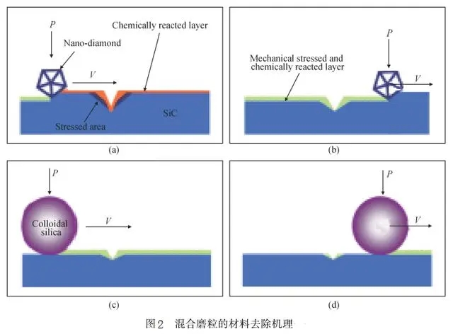 Park等將ZrO2磨粒與SiO2磨粒進(jìn)行混合,Lee等將納米金剛石磨粒與SiO2磨?;旌希梢蕴嵘齋iO2磨粒的研拋效率。在混合磨粒中,隨著納米金剛石磨粒濃度的增加,材料的研拋效率也同步增加;在研拋過程中,納米金剛石磨粒主導(dǎo)工件表面材料的去除,SiO2磨粒則負(fù)責(zé)殘留機(jī)械加工痕跡的去除。