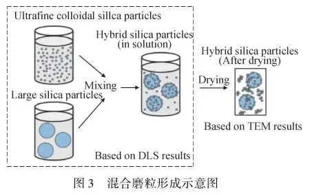 除了上述不同材質(zhì)磨粒之間的混合,還存在相同材質(zhì)不同粒徑磨粒之間的混合。Lee等將粒徑為30nm和70nm的SiO2磨粒按比例進(jìn)行混合,隨著兩種磨粒濃度比的改變,工件表面材料的去除方式也發(fā)生兩體和三體磨粒去除的改變,當(dāng)兩種磨粒質(zhì)量比為2∶1時,材料去除方式為兩體磨粒去除,材料的去除率最高。Bun-Athuek等將粒徑為4nm的SiO2分別與20nm、55nm、105nm的SiO2磨粒混合,混合磨粒的形成示意圖分別如圖3所示,發(fā)現(xiàn)超細(xì)磨粒吸附在大粒徑磨粒外圍,改變了大粒徑磨粒的形貌特征,提升了研拋效率。Lee等將粒徑為30nm的球形磨粒和70nm的非球形磨粒進(jìn)行混合,相比球形SiO2磨粒,混合磨??娠@著提升研拋效率;此外,提升球形磨粒在混合磨粒中的比例,可以改善非球形磨粒的切削能力,提升研拋質(zhì)量。